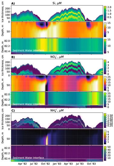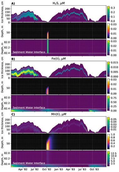 In Figure 6 and Figure 7 it is demonstrated that a long ice melting season leads to a strong stratification in the water column that prevents oxygen supply from the surface layer downwards. OM produced during the phytoplankton bloom leads to oxygen consumption in the subsurface layers, thereby triggering the process of denitrification and the consumption of nitrate and nitrite for OM decomposition. Variability of nitrogen species illustrates this as a temporal decrease of concentrations of nitrate and an increase of ammonia in the water column (Figure 6). Before and after this nitrate minimum, nitrate maxima are formed. For this oxygen depleted period the model also predicts an increase in content of dissolved and dissolved (Figure 7B,C), connected with the reduction of oxidized forms of these metals. Finally, trace concentrations of hydrogen sulfide appear in the bottom water (Figure 7A) due to the process of sulphate reduction that starts when oxidized forms of nitrogen, manganese, and iron are depleted. This sequence of changes of electron acceptors corresponds to the theory [] and to the classical features of the structure of the water column redox interfaces, e.g., in the Black Sea or the Baltic Sea [,,]. Similar temporal changes are observed in places with variable redox conditions, e.g., Norwegian fjords and coastal lagoons [,,]. The duration and intensity of oxygen depletion in the water column (and therefore in the sediments) are determined by the oxygen and OM supply in combination with the peculiarity of the ice regime (time and duration of the ice-melting period), that affect the distributions of chemical and biological parameters in the water column.