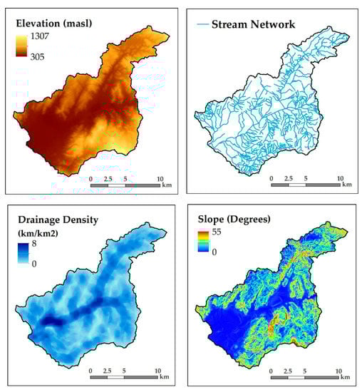 Geographic information system (GIS) processing of the digital elevation model (DEM) of Instituto Nacional de Estadística Geografía e Informática (INEGI) used to obtain the network layers of runoff, drainage density, and slopes.
