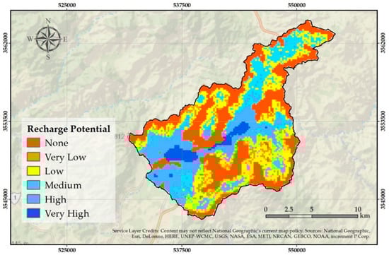 It is estimated that the Guadalupe Valley sub-basin represents a total area of 143.27 km2 (67.5% of the basin area) of areas with recharge potential. However, zones with a low recharge potential predominate, which extend across 49.39 km2 (23.26%) of the studied area. The zones with very high recharge were present only across 7.72 km2 (4%), and were those with the least spatial coverage. The surface results, by category, with their percentages are shown in Table 4. It should be mentioned that the demarcation of these zones—mainly with a potential recharge of high or very high—could be used as a tool for decision makers, with which they should define the appropriate sites to build the hydraulic infrastructure that allows recharging of the aquifer. In addition, this will promote the sustainable management of water resources in the Guadalupe Valley, which will allow the continuation of its agricultural development with the production of grapes.