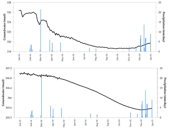In accordance to the data from the Agua Caliente weather station, a total of 108.41 mm of rain was registered during 2014–2015, with mostly isolated events ranging from 0.3 to 21.4 mm. Precipitation events, mainly during February to May, were reflected in the recharge of the static levels in the Calafia and El Porvenir trenches (Figure 8). However, in the Calafia trench this behavior was more effective, since during the rainfall of 21.4 mm in March the water level increased from 323.50 to 324.27 MSL (0.77 m); meanwhile, in the El Porvenir trench, the levels varied from 306.84 to 306.90 MSL (0.06 m).