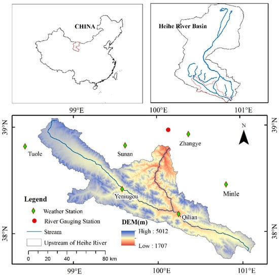 The upper watershed of the Heihe River was selected as the study region (Figure 1). The Heihe River is located on the north slope of the Qilian Mountains, lying between 38° to 39° N and 99° to 101° E, and has a total surface area of 10,009 km2. It is the transition zone between the prevailing high latitude westerlies and Asian summer monsoon, rendering this region complex and sensitive to climate change. The streamflow generated in the region is the major water resource (90%) for the entire Heihe River basin. The climate is characterized by cold and dry conditions in winter and warm and humid conditions in summer with large spatial and temporal heterogeneity. The multi-year average air temperature ranges from −5 to 4 °C. The air temperature increased by 0.37 °C/10yr in 1980–2010, which is faster than the rate over the last 60 years by 0.30 °C/10yr []. The multi-year average annual precipitation exceeds 400 mm, increasing by 15.5–16.4 mm for every 100 m rise in altitude. The precipitation increased more significantly (15.7 mm/10yr) in 1980–2010 than in the last 50 years (14.9 mm/10yr). The average annual runoff is 16.05 × 108 m3 with significant inter-annual variation. Climate change has been the main cause of streamflow variation over the last 30 years []. In the last 50 years, climate change has contributed to an increase in the total streamflow by 14.08% [].