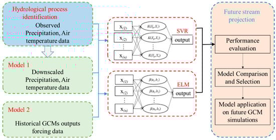 The main purpose of this study was to accurately forecast the hydrological response to future climate change. Thus, we also applied ELM and SVR to establish the relationship between hydrological components and climate predictors in the historical period and forecast under future climate scenarios. A schematic diagram for future hydrological response projection was presented in Figure 2. Firstly, we employed the observed precipitation and temperature data as inputs to drive the machine learning models to evaluate the rainfall–runoff relationship in the study area. Considering that different inputs can directly affect the forecast results, we tried to compare the results of using downscaled climate data and direct GCMs outputs on historical hydrological hindcasting. Thus, two input datasets were built for each GCM. Model 1 included precipitation and air temperature data downscaled by ELM and SVR using GCM outputs, and Model 2 directly used historical GCM outputs. Each model used eight ensemble GCMs as input to derive the ELM and SVR with the observed monthly streamflow as the output target. Finally, after the comparison and selection of the higher performance inputs and modeling combination, we applied the future GCM outputs scenarios to project future hydrological responses. Thus, we divided the 45-year historical data set representing the current climate (1961–2005) into two sub-period datasets. The first 30 years of data (1961–1990) were used to develop and calibrate the regression model, while the remaining 15 years of data (1991–2005) were used to validate the model.