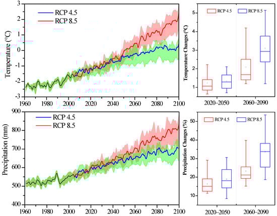 Annual temperature and precipitation variation derived from the ensemble of General Circulation Models (GCM) scenarios in the upper watershed of the Heihe River. The shadows and solid lines of the left panel represent the 90% predictive uncertainty and average value, respectively. In the box plot (right panel), the dot represents the average value and the upper and lower hinges represent the 75th and 25th percentiles, respectively. The whiskers show the other data points, except for the outliers. The line within the box shows the median.