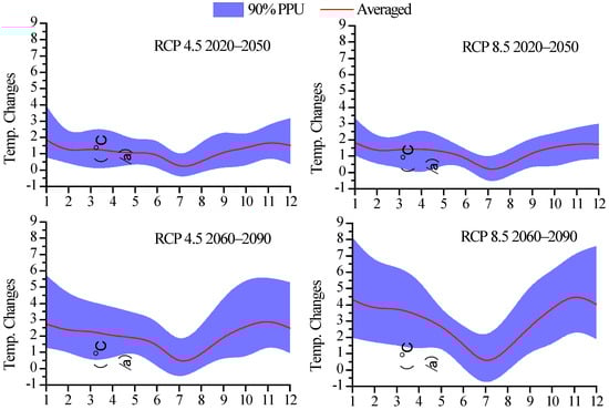 Future change tendency for the monthly temperature at different periods and under different climate scenarios. The term “Temp” represents temperature. The red line shows the median; the borderline represents 90% predictive uncertainty.
