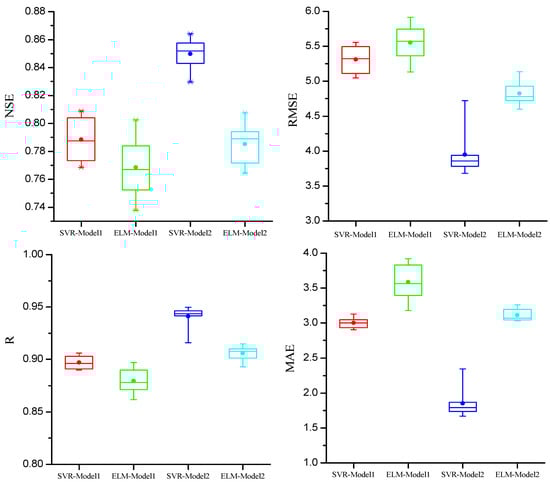 Four statistics, namely the correlation coefficient (R), the coefficient of the Nash–Sutcliffe efficiency (NSE), the root mean square error (RMSE), and the mean absolute relative error (MAE) were used to quantitatively assess the performance of the ELM and SVR results. R and NSE values close to 1 and RMSE and MAE values close to 0 indicate a more accurate model performance. Moreover, to investigate the variability of future hydrological projections, we employed the Sen Slope method and the M–K Test. The detailed information is shown in [].