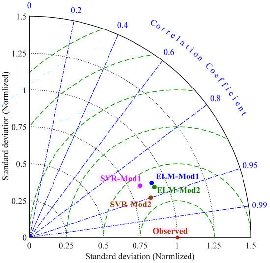 To comprehensively evaluate the performance of the hydrological responses simulated with the GCM inputs and using the SVR and ELM methods, we selected the Taylor diagram to depict the performances of the model results. The Taylor diagram provides a graphical framework that compares the simulations to reference data, which is the historically observed monthly streamflow. This gives a concise statistical summary of how closely the simulations match the references in terms of their correlations, root-mean-square differences, and the ratio of their variances, as an efficient measurement for evaluating multiple aspects of models and gauging the relative skill of many different models [,]. Figure 8 describes the streamflow performance derived from the downscaled precipitation and temperature series (Model 1) and the ensemble of GCM output predictors (Model 2). The SVR (Model 2) showed a comparably higher performance than the other three combinations with a closer location to the observed streamflow target. This indicates that directly using GCM output variables as input for SVR can reduce intermediate downscaling links between variables and can decrease the cumulative effect of bias in the projection of future hydrological responses.
