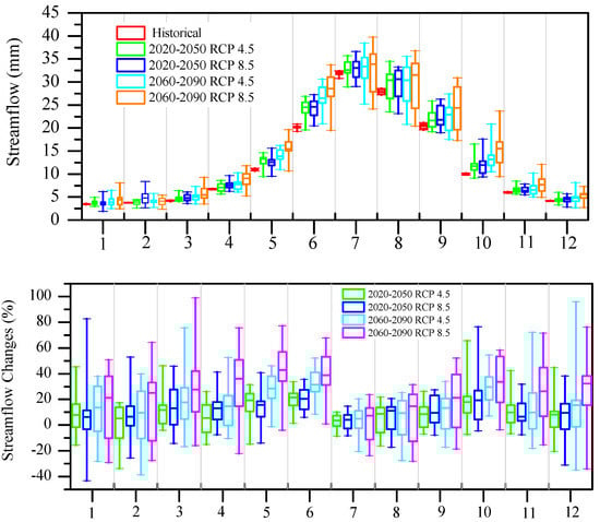 The annual streamflow will increase by 9.5% and 9.0% in the near term under RCP scenarios 4.5 and 8.5, respectively, with respect to the historical period. In the long term, the annual streamflow will increase by 13.5% and 22.0% under RCP scenarios 4.5 and 8.5, respectively, with a continuous increase in uncertainty (Figure 9). The monthly streamflow percentage changes in different periods show large variation and uncertainty. The median changes of streamflow in different months all present increasing trends. The smallest changes in streamflow occur in July with median rates of 3.18% and 3.70% in the near term and 4.64% and 3.66% in the long term under RCP scenarios 4.5 and 8.5, respectively. Meanwhile, the uncertainty in July is also the smallest when compared to the other months. The months with most increasing in streamflow are May, June, and October, and the streamflow increase is more pronounced in the long term (2060–2090) under RCP scenario 8.5. From the Sen Slope results (Table 3), we can see the changes in spring streamflow are more significant than those in the other three seasons under RCP scenario 4.5. However, under RCP scenario 8.5, the changes are all significant in all seasons except winter. Annually, in the near term, the trends of streamflow are similar under the two scenarios, while in the long term, the trend of streamflow is three times larger under RCP scenario 8.5 than under 4.5.