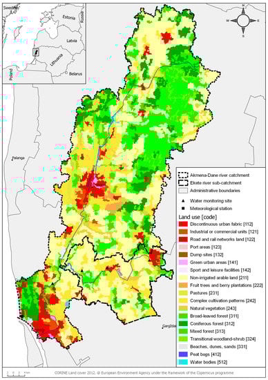 The catchment of the Akmena-Danė with the Eketė sub-catchment under the different land use in 2012. The land use from CORINE data was visualized using QGIS (3.4.1) software [,].