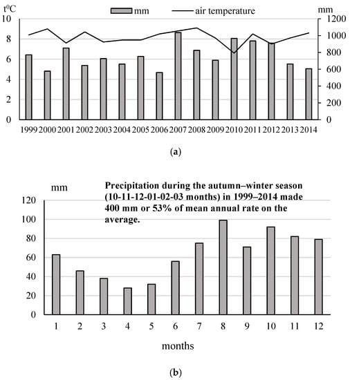 There were 6 wet, 6 dry, and 4 medium years according to the precipitation rate and MYMP during the 1999–2014 research period. The average annual air temperature was warmer for 7 years, cooler for 7 years, and average for 2 years. This research period was more humid than average and near average for air temperature. The data on mean precipitation rate by month has shown that the higher rates during period were characteristic for autumn–winter months as compared with the rest months (Figure 2b).
