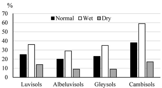 The drainage runoff volume in wet years can make from 30 to almost 60% of total precipitation volume depending on the soil type. The soils with the highest drainage runoff as a percent of total precipitation were the Cambisols, second highest were the Luvisols, followed by the Gleysols and Albeluvisols.