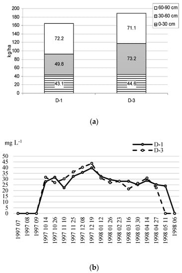 Soil N inorganic in the topsoil and subsoil layers on 28 October 1997 after the 3rd year ley ploughing and winter wheat sowing, in kg ha−1 in two drainage plots D-1 and D-3 (a); measured values of NO3-N in mg L−1 in drainage runoff in the same plots with zero fertilization (b) in 1997–1998 hydrological year (data obtained in Akademija site previously not published).