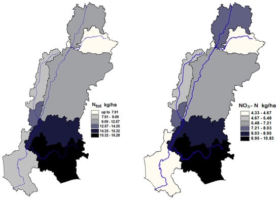 High runoff resulted in comparatively large amounts of soluble N and P compounds. The results from the application of SWAT model for the period 1997–2012 have shown (Figure 5), that annual amount of NO3-N reaching the main stream in the sub-catchments ranges from 4.3 to 10.83 kg/ha on the average.
