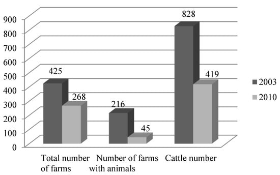 Similar results were found in the Sendvaris ward located in the lower and middle reaches of the Eketė River. The total number of farms decreased by 37%. Those farms with animals decreased almost 5 times, and the total number of cattle decreased two times as compared 2010 with 2003 (Figure 7).