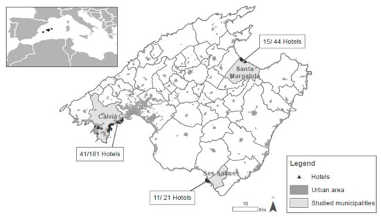 Three representative tourist municipalities on the island were selected for our study: Calvià, Ses Salines, and Santa Margalida, in southwestern, southeastern, and northeastern Mallorca, respectively (Figure 1). All three municipalities are coastal regions and their hotel plants are mainly focused on the sun-and-sand market segment, representing altogether 64,450 beds, i.e., 27.25% of Mallorca’s total hotel plant.