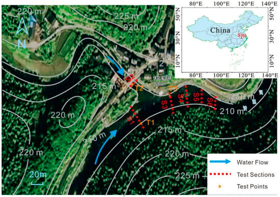 Sections S1 and S3 were located upstream and downstream of the main channel, respectively. The flow velocity, and water depth at S1 was much higher than those at S3, which meant that the upper reaches featured a higher drop with torrents and the flow in the downstream area become much slowly. Section S2 was located at tributary. Details of the hydraulic characterization are listed in Table 1.
