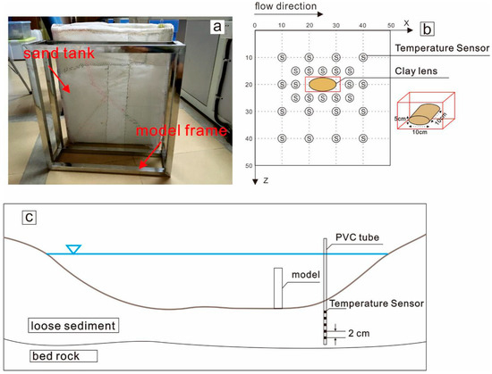 To simulate a natural streambed, we constructed a 2D sand-channel model in which the frame was welded together by aluminum alloy and wire netting wrapped in gauze, and was paved internally in order to fill the experimental material (sand, clay lens, and temperature sensors) and allow for water flow. The size of the model was 50 cm in length, 10 cm in width, and 50 cm in height (Figure 2a). The size of the clay lens was 10 cm in length, 5 cm in width, and 10 cm in height. Since the width of model and the height of lens were equal, when the lens was placed horizontally it attached the two sides of model (Figure 2b). Sensors were buried in the model to record the temperature distribution of this “artificial streambed”. The interval between sensors in the horizontal and vertical directions was 10 cm and refined to 5 cm around the clay lens (from x = 10 cm and z = 10 cm to x = 40 cm and z = 40 cm, Figure 2b).