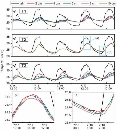 Figure 3 shows the temperature fluctuation in the air and natural streambed at different depths for T1, T2, and T3 from July 11 to July 20. Temperature changes with time formed a quasi-sine wave and change smoothly. Some small irregular fluctuations appeared during the test period, possibly because of changes in the solar radiation and wind. At the end of each test, the temperature exhibited a rapid increase because the sensors were moved out from the stream.