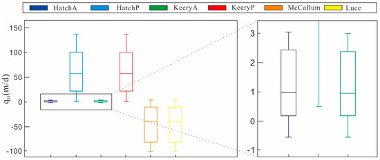 Table 4 lists the values of the parameters used in VFLUX2. The data was selected from several similar field tests [43,65,66]. Figure 4 showed the mean and coefficient of variation (Cv) of the VHF calculated by six analytic methods. The six methods had significant differences that the order of VHF ranged from 10−2 to 102 m/day. Hence, the results of HatchA and KeeryA were enlarged and shown in Figure 4.