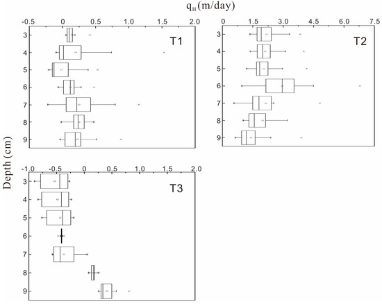Figure 5 shows the ranges of the VHF calculated by HatchA at depths from 0.03 m to 0.09 m, which were determined by the depths of the sensors and the rule of slide windows. The absolute value of the VHF at T1 was lowest at the three test points where the mean ranged from −0.178 to 0.247 m/day and the median ranged from −0.126 to 0.227 m/day. The VHF was close to 0, indicating that the hyporheic flow was relatively weak. It is noted that the positive and negative signs represent the direction of the VHF, i.e., a positive value indicates water flowing from the stream to the streambed.