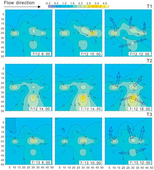 The field experiments were embedded in the natural environment in order to analyze the influence of the clay lens and surface water velocity on the VHF. Each experiment lasted more than 6 h to ensure the reliability of the raw temperature data and that the amplitude and phase signal could be extracted correctly. Figure 6 shows the spatial distribution of VHF at the artificial streambed without clay lens at T1, T2, and T3, indicating changes in the VHF with time. The pattern of the surface water velocity at each point probably does not change a lot owing to the short test period for each experiment.