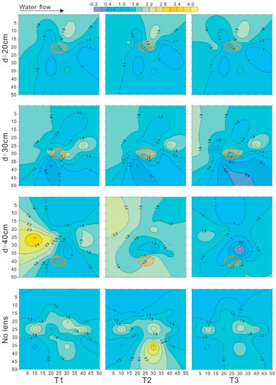Stonedahl et al. [67] found a strong correlation between the flow rate and the placement of high-permeability grid cells in regions of high hydraulic head gradients. In this study, the area near the upstream was prone to suffer scouring. At T1, the surface flow velocity and water depth were highest among the three points. Interestingly, the distinctions between upstream and downstream only existed when the lens was at 40 cm in depth. That is, when the lens was at 20 cm or 30 cm, this distinction could not be observed. Except for the distinction between upstream and downstream at the same points, the distinction between different points when the lens was at the same depth was also subtle.