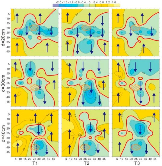 In this study, hyporheic flow was embodied by the pattern of flow field, which has difficulties on distinguishing the effect of clay lens. Hence, each VHF field at different test points with a clay lens was subtracted by the blank control for corresponding sites. The new VHF fields reflected the influence of the clay lens and surface water velocity more clearly (Figure 8). Two effects of enhancement and hindering were distributed in different area and the domain of each area was no significant difference. Focus on the hindering effect, the existence of a clay lens suppressed the hyporheic flow in the surrounding area of the lens. The shape of the suppressed area also changed with the depth of clay lens. For the three test points, the VHF field at T2 was different from those of T1 and T3 to some extent, especially at a depth of 20 cm. This was indirectly affected by the surface water velocity. Our experiments graphically demonstrated that the enhancement and hindering effects of clay lens on hyporheic flow was also coexist in natural river, however it still remained challenges to quantify the range and transformation of these two effects.