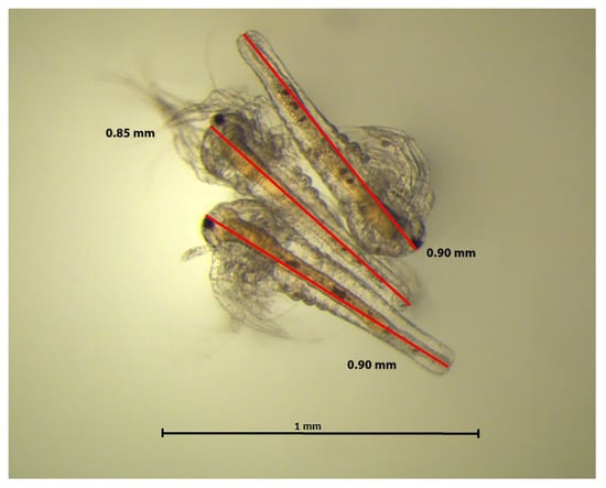 From each flask, 50 individuals were randomly collected at 24, 48. 72 h of exposure, they were placed in a petri dish under an Olympus SZX-9 stereomicroscope connected with an Infinity-1 microscopy camera (Teledyne Lumenera, Ottawa, Canada) and were photographed in triplets. Digital photos were used in order to measure the body length of the larvae to the nearest 1 mm, by measuring the length between the well-pigmented eye and the poorly defined end of the tail [14] (Figure 1) but also to identify any other potential malformations. Processing of the digital photos was performed using the software analySIS getIT 5.1 (Olympus Soft Imaging Solutions GmbH, Münster, Germany).
