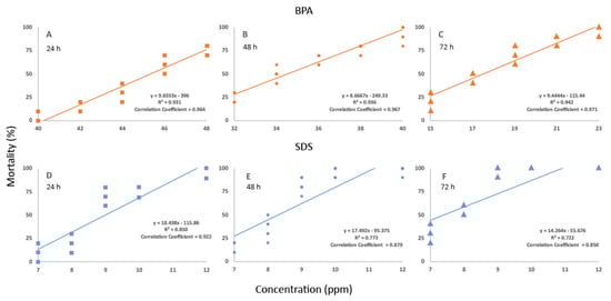 Concentration—Mortality curves and the estimated linear regression equations after exposure of Artemia franciscana nauplii to BPA for: (A) 24 h, (B) 48 h, (C) 72 h, and to SDS for: (D) 24 h, (E) 48 h, and (F) 72 h.