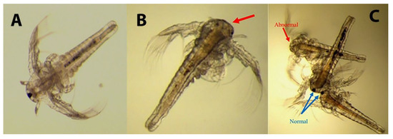 After 24, 48, and 72 h of exposure, larvae that were completely motionless were considered to be dead, and the percentage of mortality was calculated when compared to the control. The term “motionless” means organisms that do not change their own barycenter position and do not move any appendages within 10 to 15 s [9,14]. Tests were considered valid when control mortality did not exceed 10% [10].