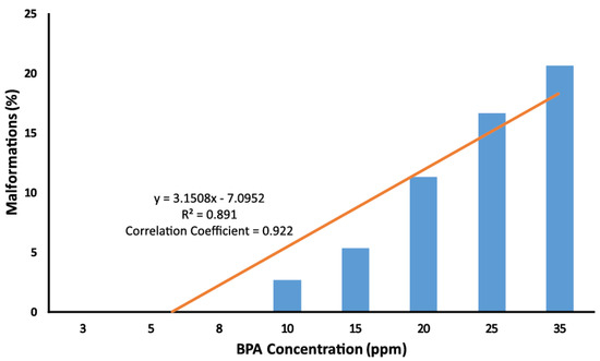 Apart from the inhibition of growth, no other malformations were recorded, except from the 72 h of exposure on BPA culture, where a significant abnormal growth of the central eye of the nauplii was detected (Figure 3). Results from the percentage of affected larvae displayed a strong linear increase (correlation coefficient > 0.90), which ranges from 2.67% at 10 ppm to 20.67% at 35 ppm concentration of BPA (Figure 4).