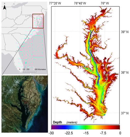 The Chesapeake Bay watershed extends to an area of more than 102,400 km2 that covers parts of Delaware, Maryland, New York, Pennsylvania, Virginia, and West Virginia. The bay is classified as a highly productive water system []. The high productivity is associated with excessive nutrients carried into the bay water through river discharge []. The Chesapeake Bay watershed receives a high volume of precipitation (1250 mm annually) that generates an annual run-off equivalent to 400 mm.