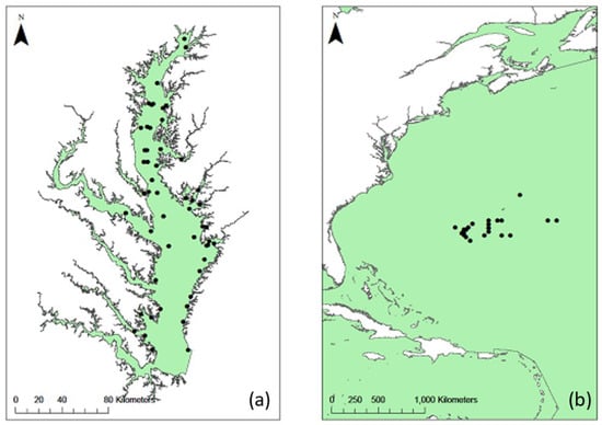 Map showing the locations of Chl-a in situ measurements used in our study. (a) Monitoring stations used for the validation of the Ocean Color 3M (OC3M) algorithm in Chesapeake Bay, and development of the GROC4 algorithm and (b) Sampling locations in the Sargasso Sea, Atlantic Ocean.