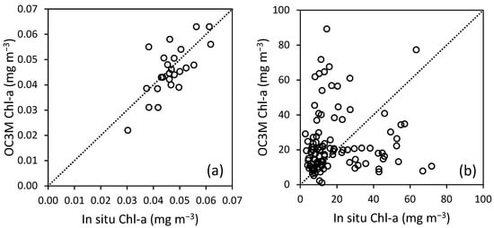 Scatter plots compare the OC3M derived Chl-a concentrations with in situ concentrations in (a) Sargasso Sea (case 1) and (b) Chesapeake Bay (case 2). The dotted lines represent 1:1 line.