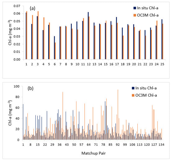 Clustered columns compare the OC3M algorithm derived and in situ Chl-a concentrations in (a) Sargasso Sea (case 1) and (b) Chesapeake Bay (case 2).
