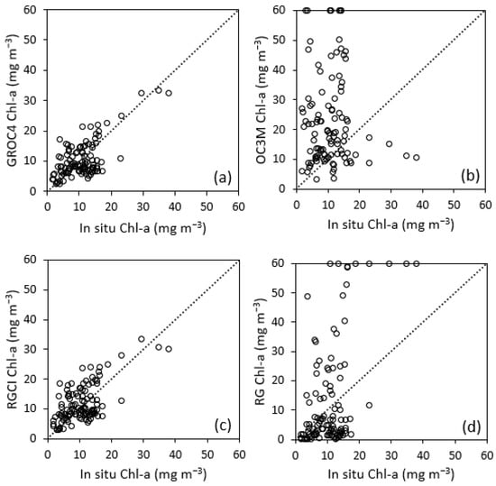 The performance of the GROC4 algorithm is superior among the four algorithms compared in our study, although the RGCI algorithm presents a comparable result. The GROC4 algorithm performed slightly better than the RGCI algorithm for almost the whole range of Chl-a concentration, but the improvement was more evident at >20 mg m−3 of concentrations (Figure 5). This improvement was possibly associated with the maximum band ratio formulation of the GROC4 algorithm. Applying the observation from the mesocosm tank experiment of Schalles, et al.—i.e., with increasing Chl-a concentration the reflectance peak in the green band and trough in red band shifts towards the higher wavelength—the GROC4 algorithm was possibly able to more efficiently target the peak reflectance in the green band and trough in red band than the RGCI algorithm [,]. The fact that the improvement was more evident at higher concentrations further supports this hypothesis. Both GROC4 and RGCI underestimated the Chl-a concentration for most of the matchup pairs in the range of 10–20 mg m−3. For the other two algorithms, OC3M overestimated for concentrations <20 mg m−3 and underestimated for concentrations >20 mg m−3. In contrast, the RG algorithm did not show any consistent pattern, and. RG algorithm-derived concentrations were deviated from the in situ concentrations for the whole range. Even though the r-square of RG algorithm was highest among the three red-green algorithms, other statistical measures, as well as the scatter plot, showed that the algorithm was not performing well for the data set. This illustrates that a good r-square may not necessarily mean an algorithm is performing well and instead a number of statistical parameters should be considered when comparing algorithm performance.