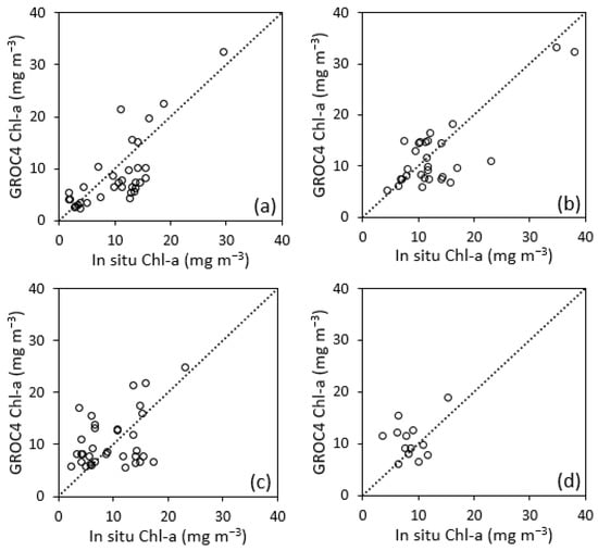 Seasonal comparison of in situ and GROC4 algorithm derived Chl-a in Chesapeake Bay for: (a) spring (b) summer (c) autumn and (d) winter.