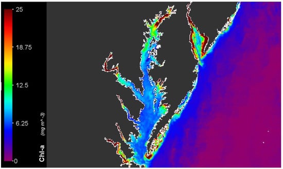 Example of Satellite-estimated Chl-a concentrations for Chesapeake Bay obtained by applying the GROC4 algorithm on MODIS level-2 image (dated 18 October 2017).