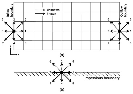 Open boundary conditions refer to known macroscopic boundary values or functions at boundaries (e.g., known water depth at inflow or outflow boundaries). If flow velocity and water depth at the boundaries are known, unknown distribution functions can be computed using Equations (17) and (18) following the method described by Zou and He [57]. For example, at the inflow boundary (see Figure 1a), Equations (17) and (18) lead to the following three equations: