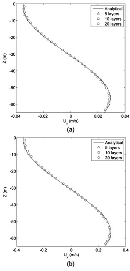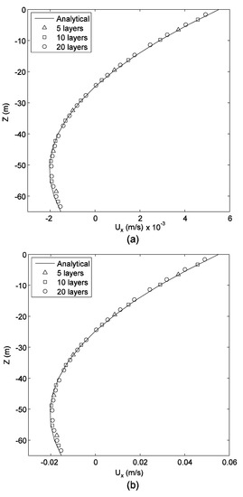 The wind-driven circulation validation is performed for two different wind stress values, = 0.03 N/m2 and = 0.3 N/m2. Wind direction is along the positive x direction. The physical parameters for this case are ∂ρ/∂x = 0, ∂ρ/∂y = 0, ρ = 1025 kg/m3, ρa = 1.2 kg/m3, CW = 0.0015, μ = 0.004 m2/s, = 0.005 m/s. As shown in Figure 2, the multilayer MRT-LBM solutions from the 5-layer model to the 20-layer model compare well to the analytical solutions for ux profile at the location (x, y) = (1700 m, 700 m) (the center of the lake). Figure 2 indicates that the 10-layer model is sufficient to capture the velocity profile.