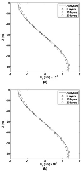 Comparisons of numerical model prediction with an analytical solution for the density-driven case: (a) ∂ρ/∂x = −5 × 10−7 kg/m4, and (b) ∂ρ/∂x = −5 × 10−5 kg/m4.