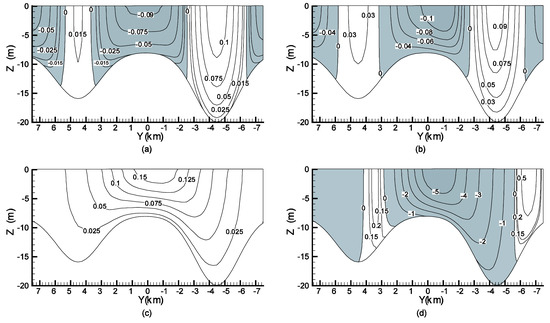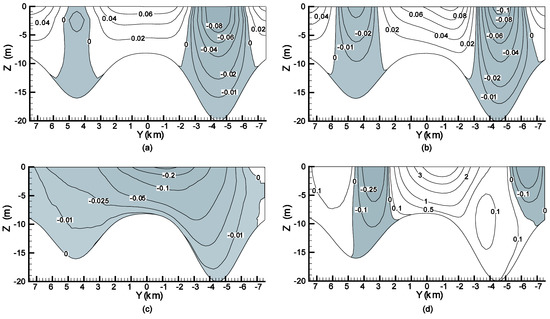 Contours of ux velocity (m/s) at (a) x = 50 km and (b) x = 98 km and contours of uy velocity (m/s × 10−2) at (c) x = 50 km and (d) x = 98 km for the wind-density-driven case. The dark areas represent negative velocities.