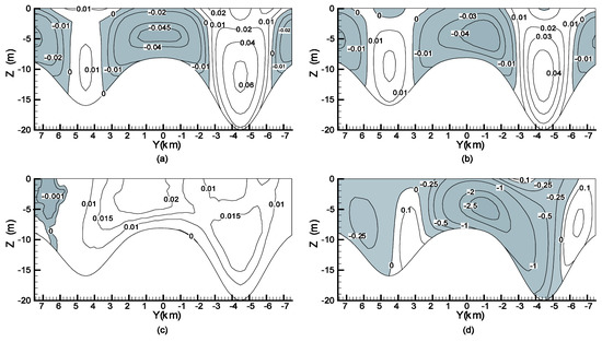 Contours of ux velocity (m/s) at (a) x = 50 km and (b) x = 98 km and contours of uy velocity (m/s × 10−2) at (c) x = 50 km and (d) x = 98 km for the wind-driven case. The dark areas represent negative velocities