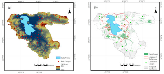 Map of the Lake Urmia basin showing the location of (a) rain gauges and (b) the ungauged buffer zone and marginal sub-basins designated in this study.