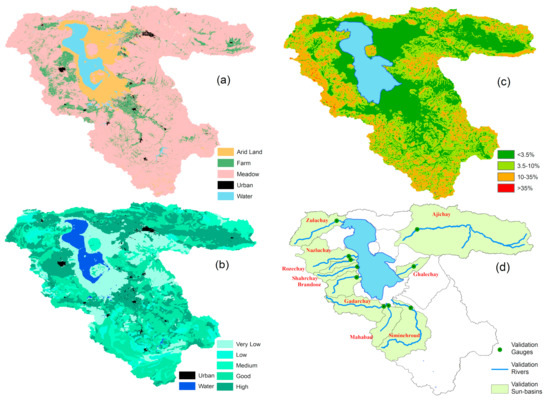 Lake Urmia basin data: (a) land use, (b) permeability, (c) slope, and (d) validation gauges.