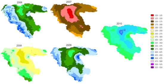 The precipitation layers for 2006–2011 obtained by cokriging interpolation of rain gauge values with DEM and TRMM 3B43 V7, as the best method, revealed high values of precipitation in marginal areas of the basin (Figure 4). As can be seen from Figure 1a, these marginal areas have high elevation and use of DEM in the estimation process resulted in higher values of precipitation for these mountainous regions.