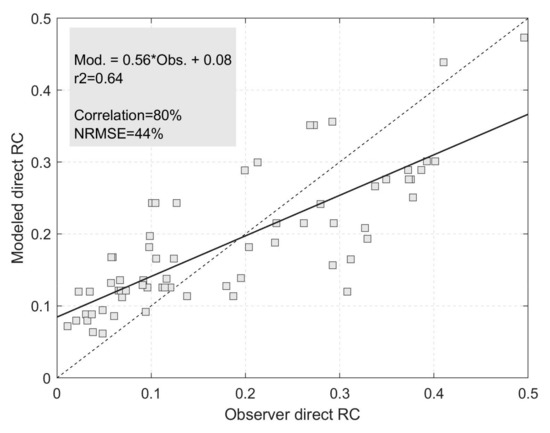 As can be seen from Figure 5, when the observed direct RC was lower than 0.2, most of the values less than 0.2 were above the 1:1 line in the first quadrant, i.e., the model overestimated direct RC in this range. At values greater than 0.2, the model underestimated direct RC.