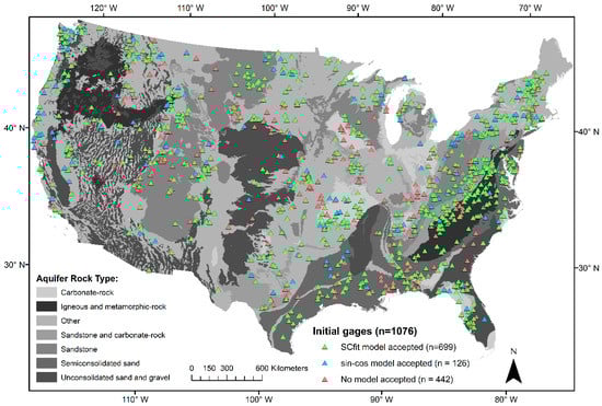 Select GAGES-II locations that have accepted OHS models (SCfit and sin-cos) or rejected OHS models (pink triangles). Accepted models span the CONUS and a variety of aquifer rock types.