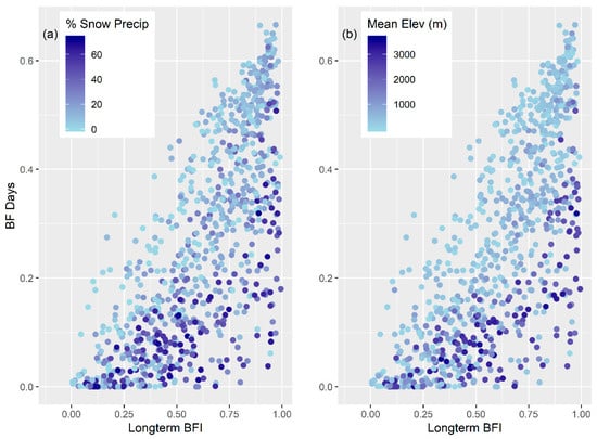 The long-term average base flow index (x-axis) compared to BF Days (y-axis). Sites are colored by the (a) average percent of snow that contributes to total annual precipitation and (b) the mean elevation within the watershed. Watershed slope is not displayed here, but mimics patterns like mean elevation in the watershed.