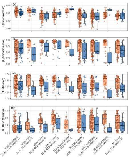 Distributions of (a) α, (b) β, (c) BFI, and (d) BF Days for each aggregated ecoregion [34,58]. “Southeast” is abbreviated as “SE”. The orange box plots represent SCfit model types and the blue box plots represent sin-cos model types. The number of samples are listed by model type in the x-axis.