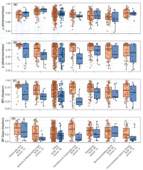 Distributions of (a) α, (b) β, (c) BFI, and (d) BF days for each aquifer type [57]. The orange box plots represent SCfit model types and the blue box plots represent sin-cos model types. The number of samples are listed by model type in the x-axis.